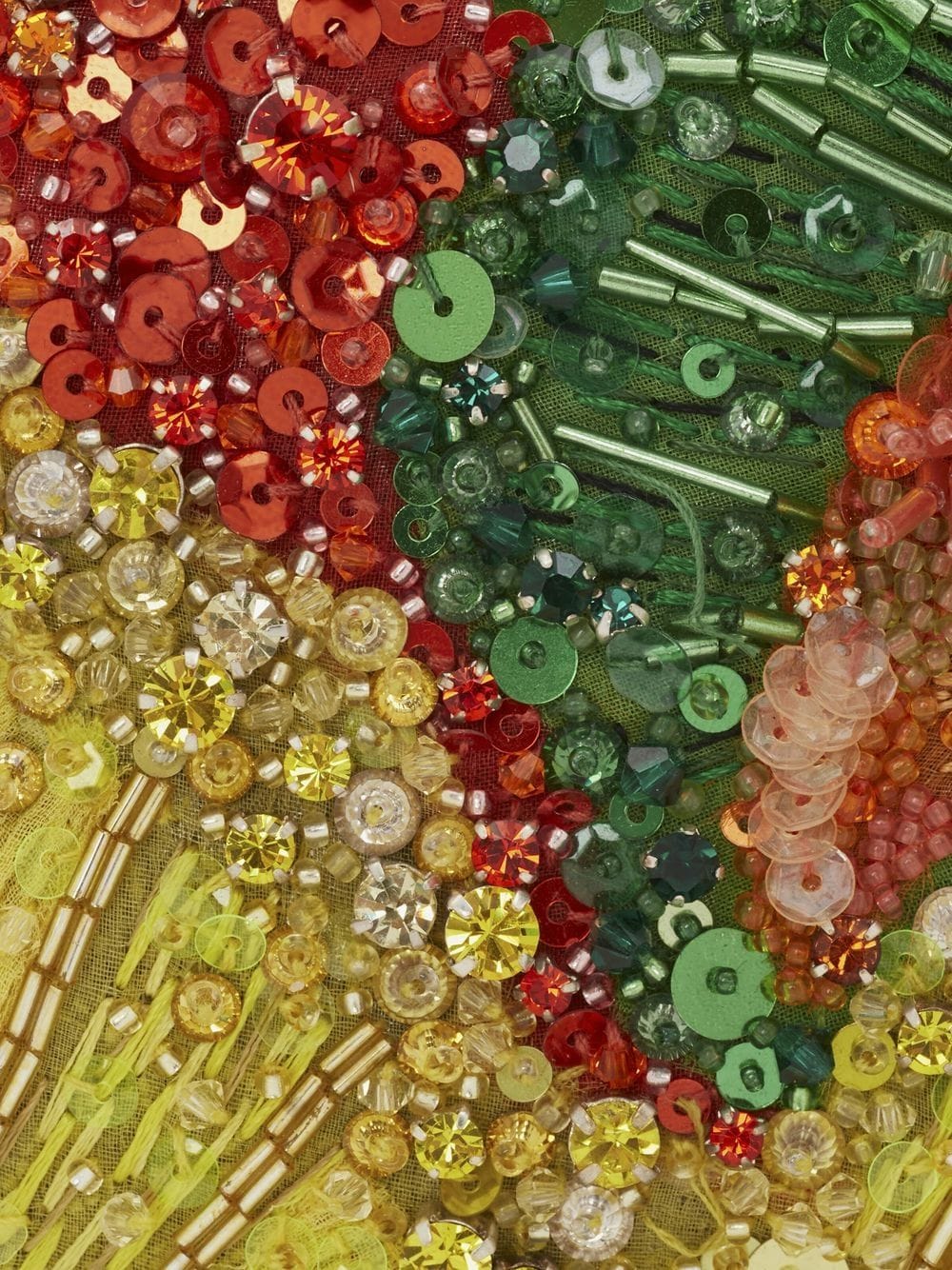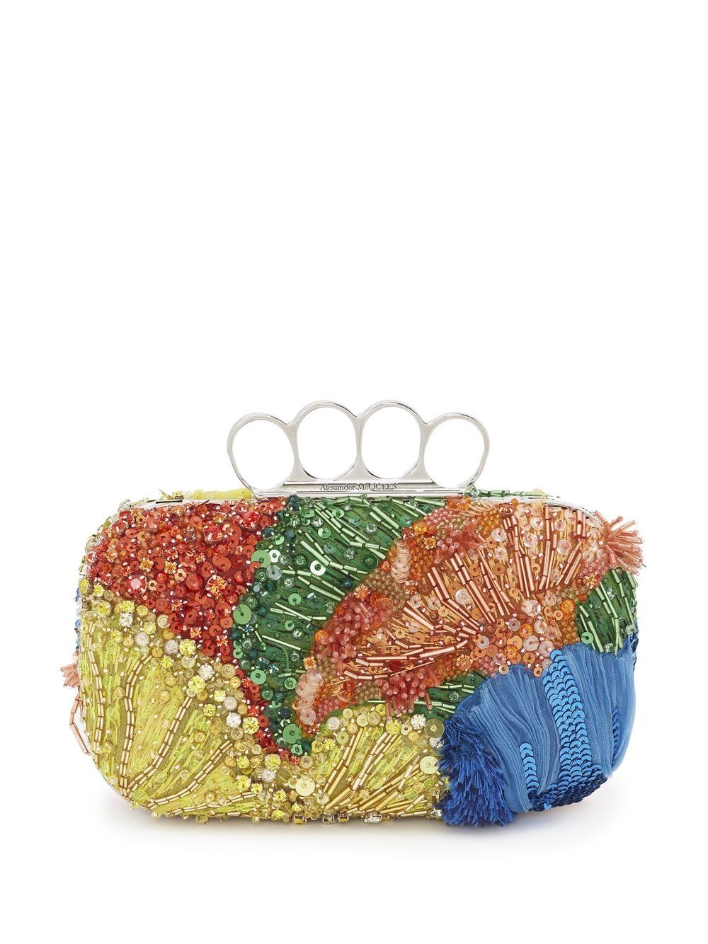 beaded knuckleduster clutch bag from Alexander McQueen featuring multicolour, lambskin, bead embellishment, sequin embellishment, knuckleduster design, silver-tone hardware and hinged.