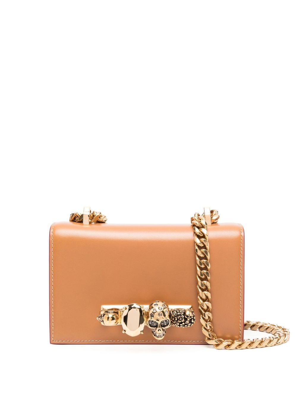 embellished leather crossbody bag from Alexander McQueen featuring skull appliqué, polished effect, crystal embellishment, foldover top, chain-link shoulder strap, snap-fit fastening, main compartment and internal slip pocket.