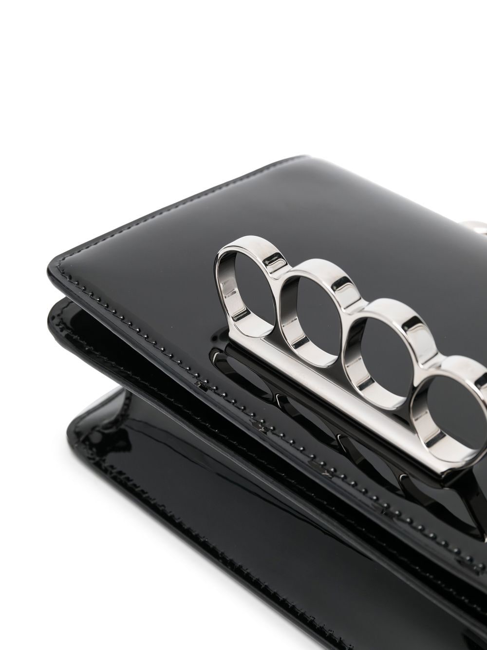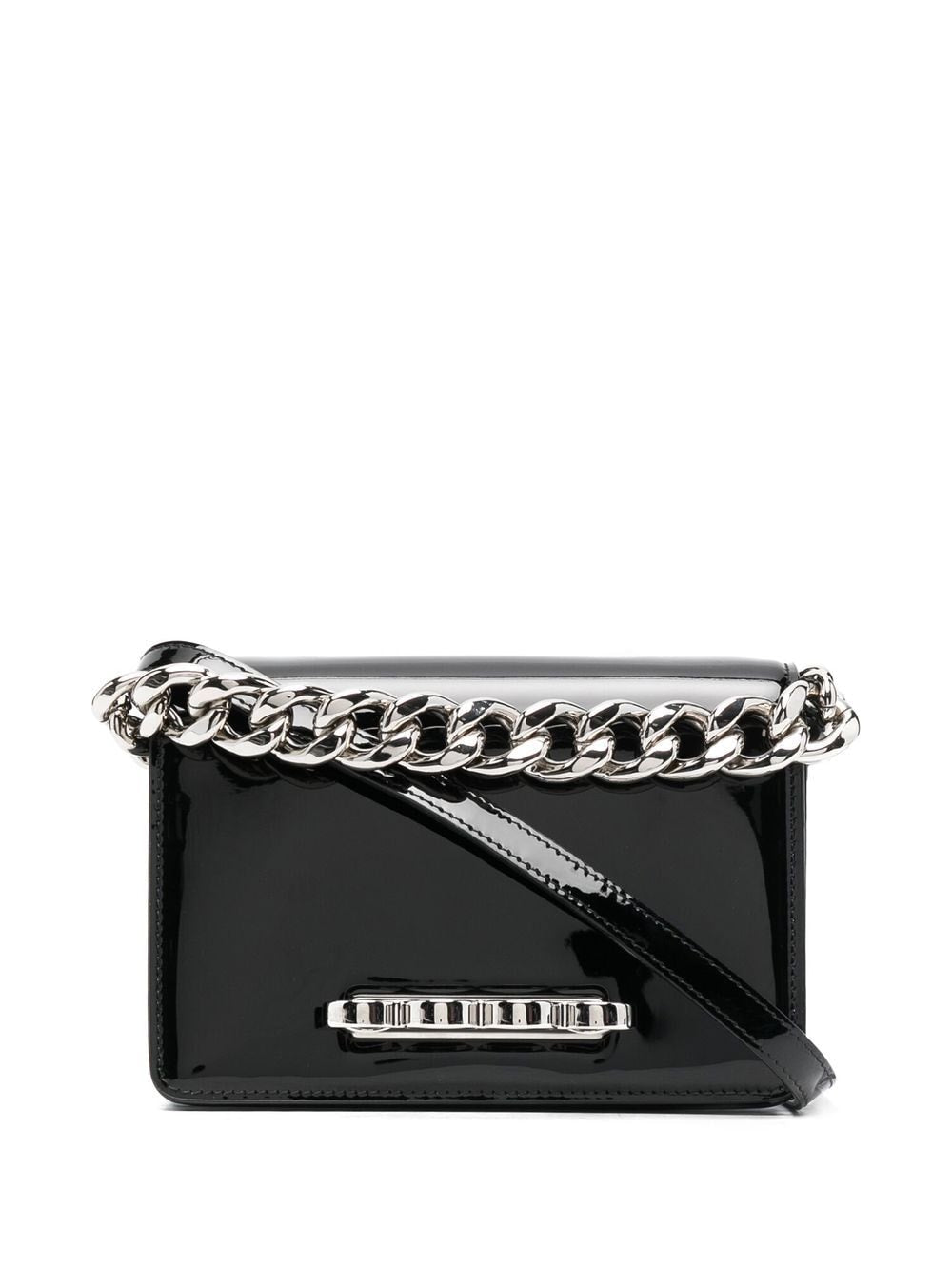 Four ring patent-leather tote bag from Alexander McQueen featuring black, calf leather, patent leather, silver-tone logo lettering, signature Four Ring handle, chain-link shoulder strap, foldover top and single shoulder strap.