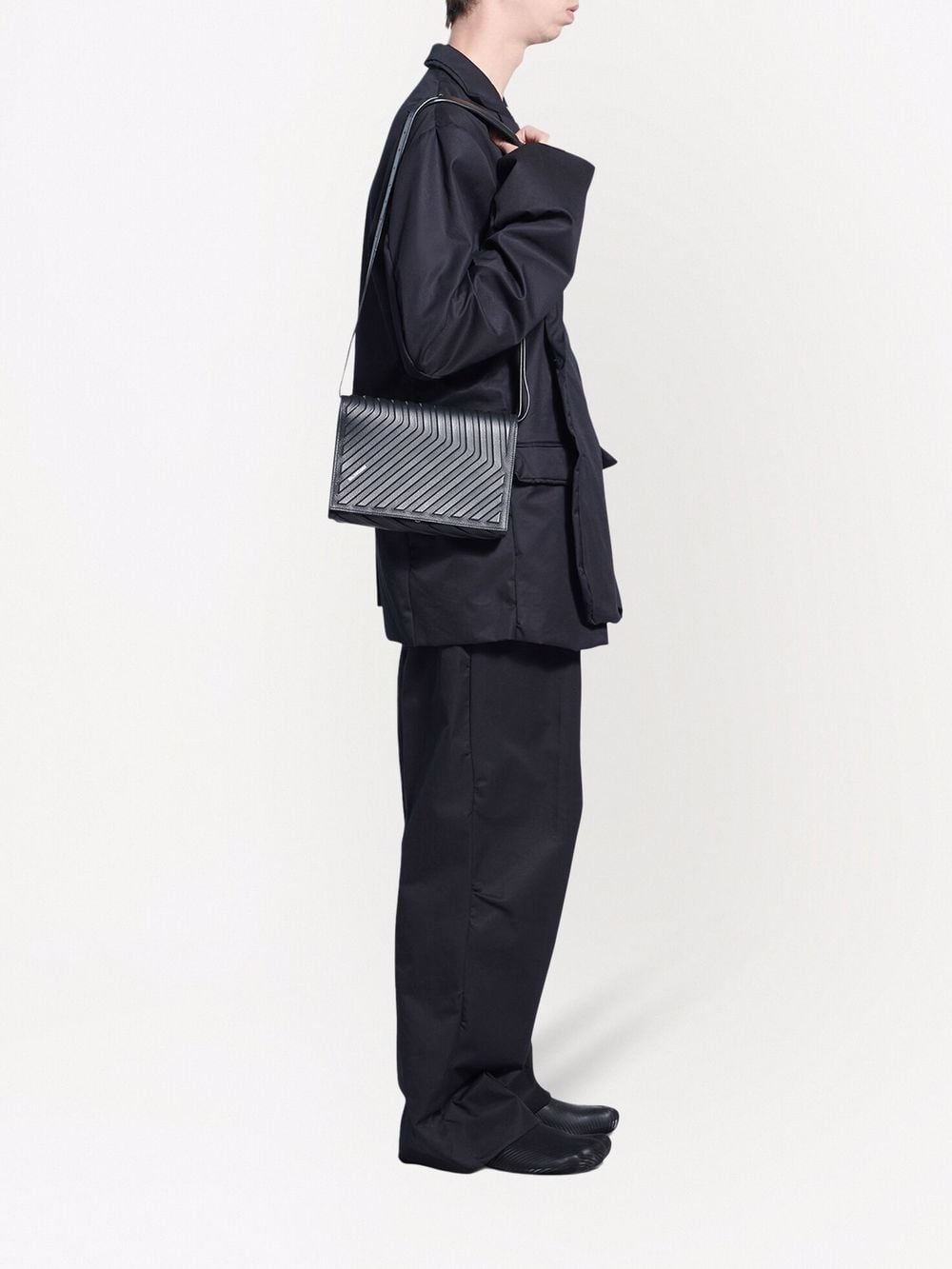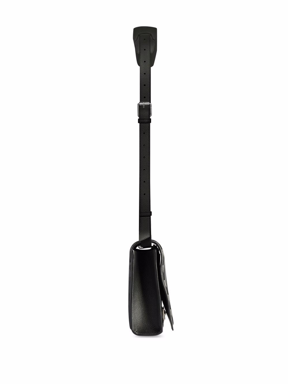 Balenciaga applies their signature design aesthetic to this practical shoulder bag for SS22. Fabricated in Italy from black calf leather, the versatile accessory is instantly recognisable thanks to its ridged front flap, which features a contrasting white logo print.