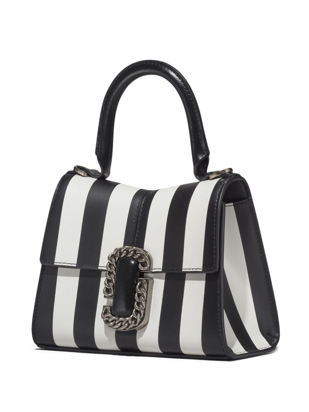 Black and white stripes adorn this Marc Jacobs bag from the AW23 season. In a classic silhouette, the leather-constructed accessory boasts an instantly recognisable motif: the Double J plaque. Meant to be worn as a shoulder bag — see the chain link strap that can be detached — it can also be carried by the top handle, offering a versatile look.