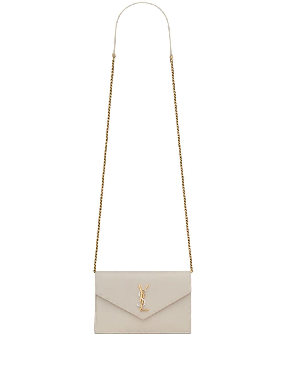 Designed like an envelope, the Cassandre bag is made recognisable by the YSL logo plaque at the front. The gold-tone chain-link shoulder strap contrasts with the cream white leather body.